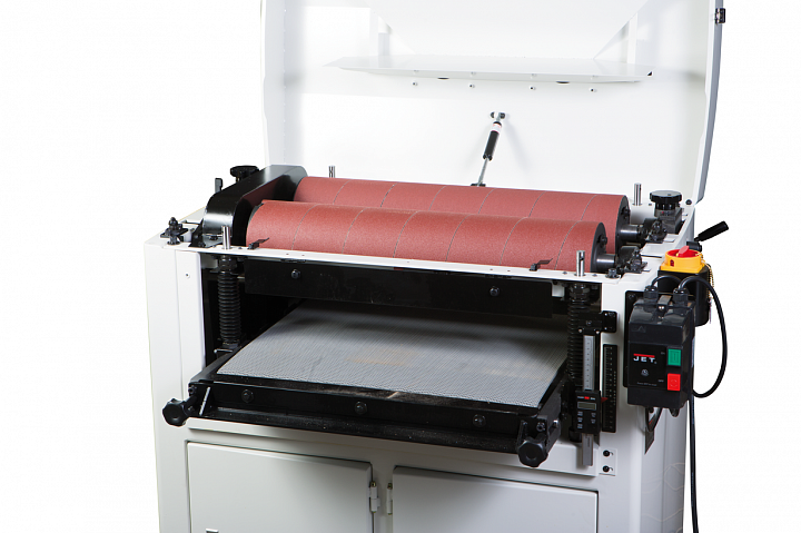 Jet DDS-237 – мощный профессиональный шлифовальный станок, предназначенный для эксплуатации на производстве. При условии небольшого съёма материала подходит для калибрования изделий из дерева, клееных пустотелых фасадов, деталей из МДФ и прочих подобных, причем их сразу же можно будет оклеивать пленкой без дополнительной шлифовки.