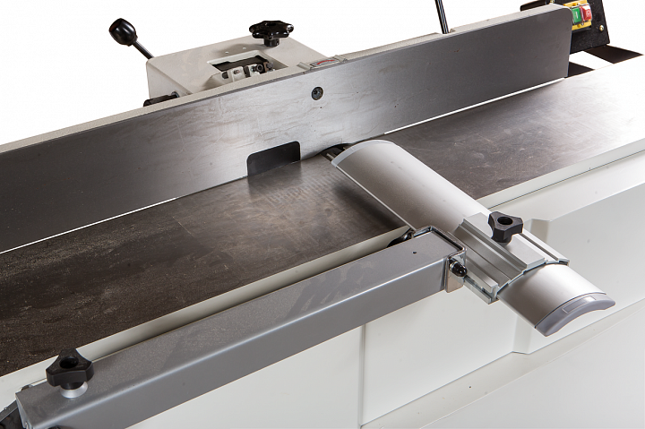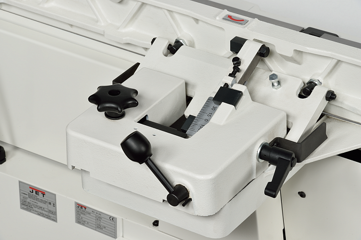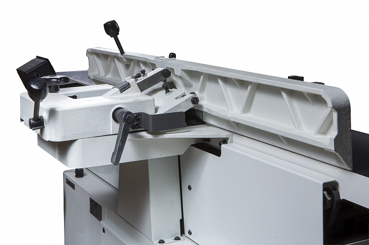 Станок укомплектован массивным чугунным фуговальным упором с регулировочным механизмом червячного типа. Он обеспечивает точную и жесткую установку угла наклона в диапазоне от прямого положения до 45° влево или вправо.