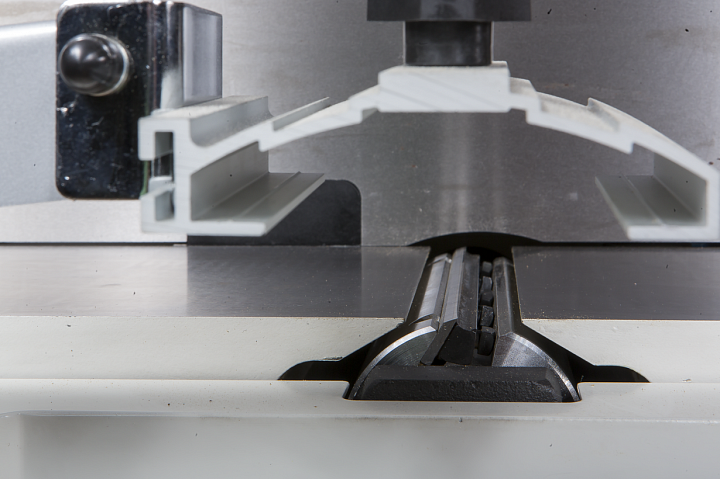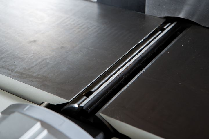 Отличительная особенность новинки – параллелограммный механизм регулировки высоты столов. В сегменте компактного оборудования такая схема получила распространение сравнительно недавно и пока еще более характерна для тяжелого промышленного оборудования. Вместо наклонных скользящих направляющих в ней используются рычаги на осях, нет ни винтов, ни эксцентриков, а усилие от рукоятки прикладывается непосредственно на сторону параллелограмма. Внутреннее трение и люфты в такой конструкции минимальны, что позволяет при настройке перемещать тяжелые столы (регулируются оба: и приемный, и разгрузочный) с наименьшими усилиями и максимально точно.