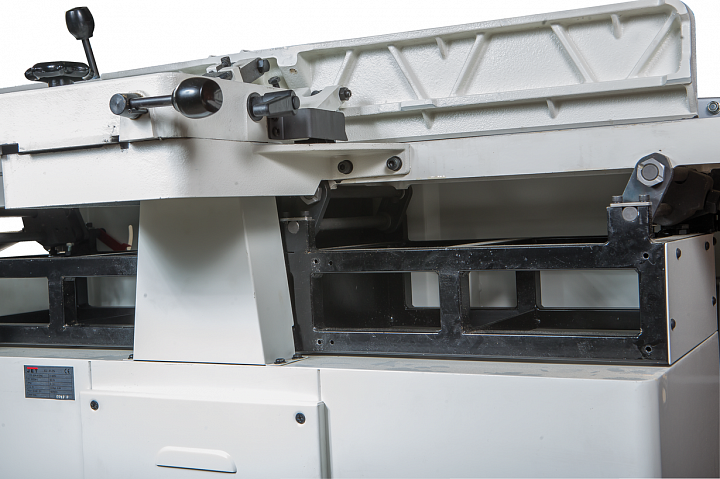 Отличительная особенность новинки – параллелограммный механизм регулировки высоты столов. В сегменте компактного оборудования такая схема получила распространение сравнительно недавно и пока еще более характерна для тяжелого промышленного оборудования. Вместо наклонных скользящих направляющих в ней используются рычаги на осях, нет ни винтов, ни эксцентриков, а усилие от рукоятки прикладывается непосредственно на сторону параллелограмма. Внутреннее трение и люфты в такой конструкции минимальны, что позволяет при настройке перемещать тяжелые столы (регулируются оба: и приемный, и разгрузочный) с наименьшими усилиями и максимально точно.