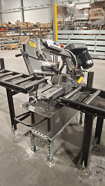 Процесс установки заготовок под нужным углом осуществляется за счет имеющихся механических тисков, оборудованных поворотными губками. Подъем и опускание тяжелой пильной рамы осуществляется за счет функционирования системы гидроразгрузки. С помощью гидроцилиндра можно осуществить регулировку скорости опускания консоли. Необходимое прижимное усилие рамы на обрабатываемую заготовку осуществляется за счет веса консоли.