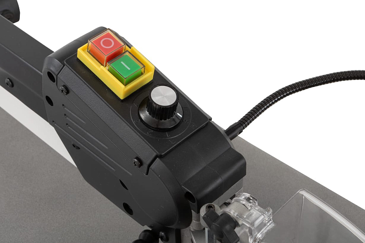 Что действительно важно для работы «целыми днями» и что самое главное - это то, что заготовки при пилении всегда располагаются на горизонтальном столе. Такой структуры нет у простеньких моделей. JSS от JET способен работать абсолютно без вибраций. При необходимости пилить под углами, наклон пилки происходит через наклон всего маятникового механизма. Для этого в подстолье с обеих сторон (фронтальной и тыльной) установлены стальные, зубчатые, направляющие полукольца. Весь механизм можно наклонить в любую из сторон вплоть до 30 в левую и до 45 в правую, просто используя для этого поворотную рукоятку. Движение пилки, верней частота хода, регулируется плавно для достижения оптимальной нагрузки и скорости пиления.