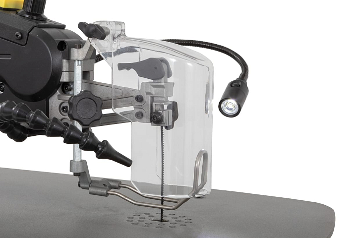 В этом станке можно использовать оба типа пилок, и со штифтами и прямые. Обдув зоны пиления через коленчатую трубку всегда можно расположить в месте, наиболее удобном для работы. Светильник подсветки тоже на гибкой стальной ноге. Он тоже не будет мешаться под руками, а будет подсвечивать именно в том месте, где он нужен. Верхнюю часть маятниковой рамы в работе можно легко поднимать в вернее положение для того, чтобы быстро продеть пилку через следующее отверстие и продолжить пилить.