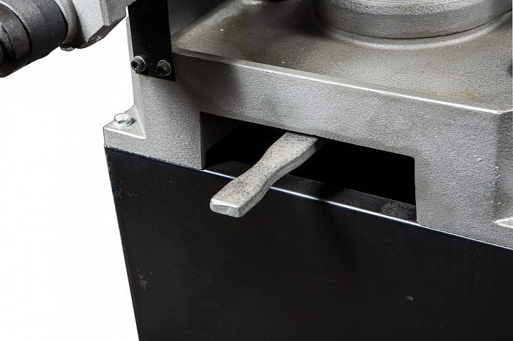 Отрезной станок имеет быстрозажимные тиски, позволяющие выполнять быструю установку однотипных заготовок. Для серийных работ, при частом повторении однотипных операции в конструкции станка предусмотрен концевой упор, регулирующий необходимую длину заготовок. Станок имеет на оснащении мощный электродвигатель - 1 кВт, способный обеспечить скорость вращения пильного диска 42 об/мин. Модификация станка с питанием от сети в 380 В, позволяет выполнять работу в 2-х режимах скорости вращения пильного диска – 42 и 84 об/мин. Управление работой двигателя осуществляется оператором с помощью регулятора скорости вращения. Двигатель оборудован кнопкой аварийной остановки двигателя.