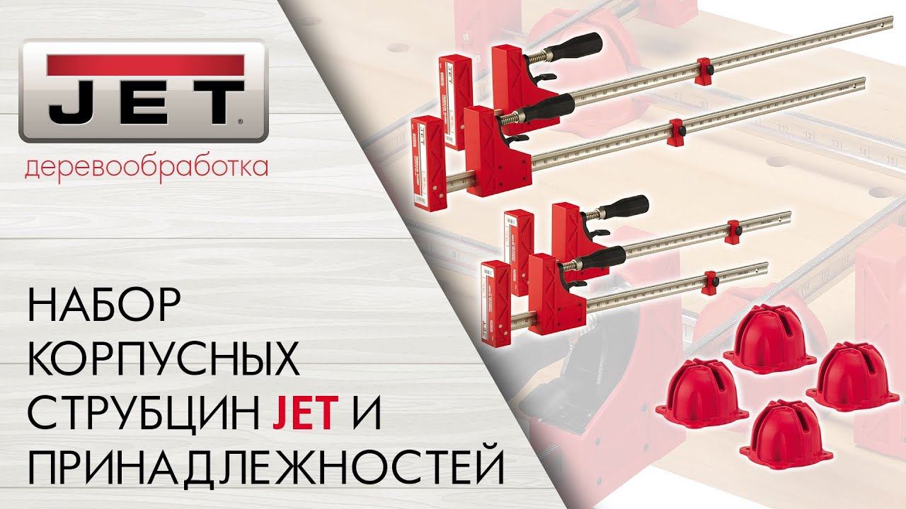 Jet 70411EU набор корпусных струбцин с необходимыми для удобной работы принадлежностями, предназначен для сборки на клею конструкций из дерева. Включает в себя четыре корпусных струбцины (подробное описание ниже) и вспомогательные приспособления. Это блоки «крест на крест» для удерживания под прямым углом и цилиндрические упоры. Они вкручиваются в корпуса блоков «крест на крест» или в упоры струбцин и применяются для их фиксации на рабочей поверхности с круглыми монтажными отверстиями.