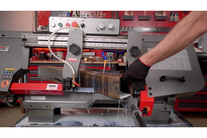 Моторная группа состоит из мощного электродвигателя - 1,5 кВт, обеспечивающего стабильную работу ленточного станка в различных скоростных режимах. Ременная передача позволяет осуществлять пиление заготовок на скоростях движения ленточного полотна в 29, 50, 73 и 95 м/мин. Управление работой станка осуществляется с пульта управления, установленного на консоли. Оборудование оснащено кнопкой аварийной остановки.