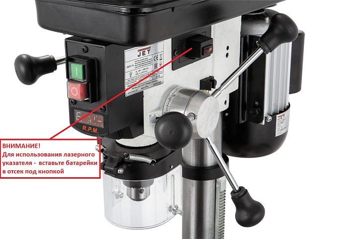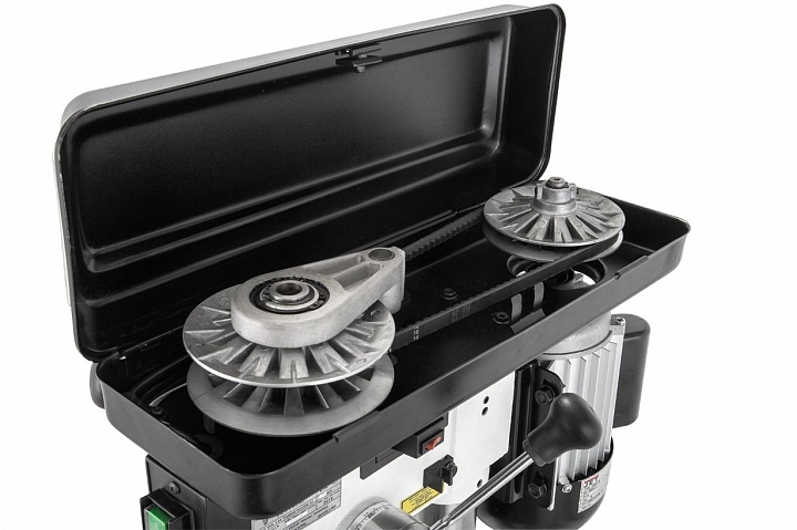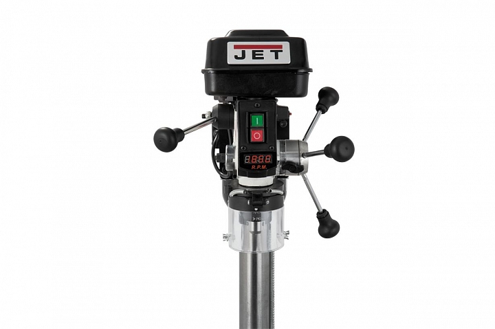 JWDP-10 это настольный сверлильный станок с вариатором для работы в небольших мастерских с деревом, металлом и другими материалами. Его конструкция базируется на узлах и деталях профессиональной модели JWDP-12, но имеет ряд отличий: уменьшены общие размеры, изменено устройство стола, использован ключевой патрон и т.п. Эти меры позволили снизить стоимость при сохранении основных достоинств: частота вращения шпинделя меняется простым перемещением рычага управления, установленная скорость отображается на цифровом дисплее, штатная комплектация включает в себя лазерный указатель оси сверления, рабочий стол имеет Т-образные пазы для крепления тисков и прихватов, предусмотрена работа от основания.