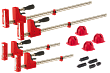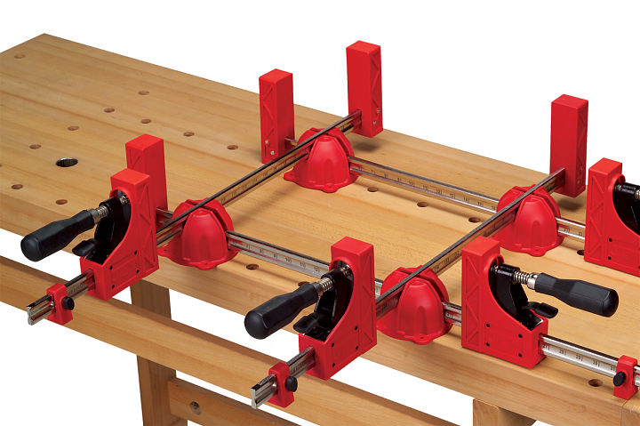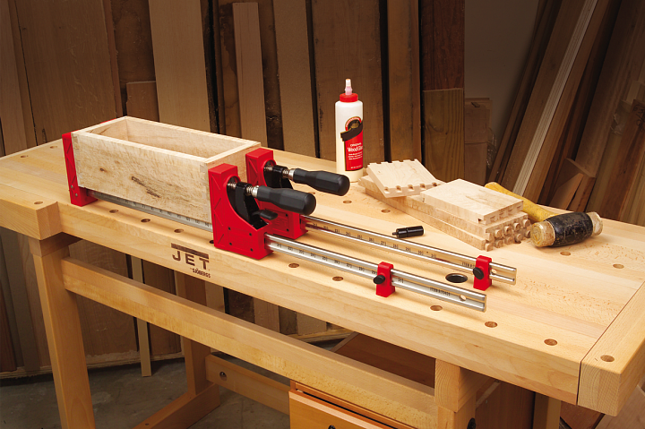 Jet 70411EU набор корпусных струбцин с необходимыми для удобной работы принадлежностями, предназначен для сборки на клею конструкций из дерева. Включает в себя четыре корпусных струбцины (подробное описание ниже) и вспомогательные приспособления. Это блоки «крест на крест» для удерживания под прямым углом и цилиндрические упоры. Они вкручиваются в корпуса блоков «крест на крест» или в упоры струбцин и применяются для их фиксации на рабочей поверхности с круглыми монтажными отверстиями.